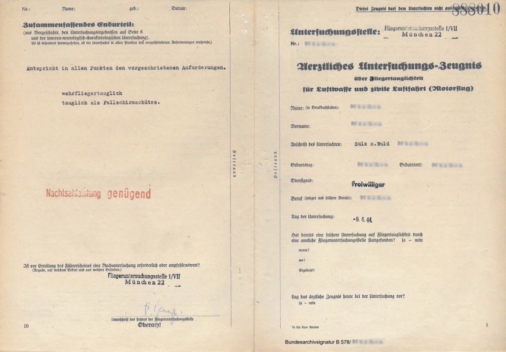 6) Bundesarchiv, Berlin (BArch) : B 578 Krankenbuchlager. Il s’agit de son « Certificat d’examen médical attestant de l’aptitude à voler pour l’armée de l’air et l’aviation civile (vols motorisés) », « Aerztliches Untersuchungs-Zeugnis über Fliegertauglichkeit für Luftwaffe und zivile Luftfahrt (Motorfluge) ».