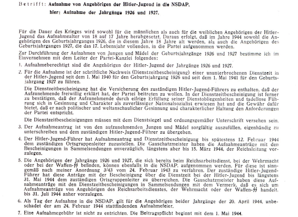 Le 7 janvier 1944, le Trésorier du Reich, le Reichsschatzmeister Schwarz, établit l’ordonnance, l’Anordnung 1/44, concernant la procédure d’admission des candidats au NSDAP pour les jeunes gens nés en 1926 et 1927, et issus des JH (« Aufnahme von Angehörige der Hitler-Jugend in die NSDAP. Hier : Aufnahme der Jahrgänge 1926 und 1927 »), qu’il envoie à tous les Gauleiter, dont Robert Wagner, Gauleiter en Alsace. Il est stipulé que le candidat doit fournir des garanties de son engagement et notamment qu’il devait avoir servi aux JH sans interruption depuis le 1er mai 1941 (pour les jeunes gens nés en 1927). C’est le responsable local NSDAP des JH, lui-même membre du parti, qui devait attester de cet engagement. Le candidat devait se montrer digne de pouvoir rejoindre le parti nazi. Le formulaire de demande d’admission au parti devait être rempli et signé par le candidat, puis remis au responsable local des JH. Devait être joint à la demande une attestation établie par le responsable des JH, le dossier devant être remis avant le 12 février 1944 au NSDAP-Ortsgruppenleiter, puis de là au Gauleiter. La demande d’admission devait être envoyée par le Gauleiter à la Reichsleitung du parti nazi (Maison Brune) à Munich avant le 15 mars 1944. La date d’admission retenue pour ces nouveaux admis sera, comme stipulé dans l’Anordnung, systématiquement le 20 avril 1944 (date d’anniversaire d’Adolf Hitler). Les cotisations pour le parti ne commenceront alors qu’à partir du 1er mai 1944. En étant admis comme membre du parti, il a acquis la pleine nationalité allemande 1. Il possédait également cette nationalité allemande définitive à compter de son incorporation 2.
