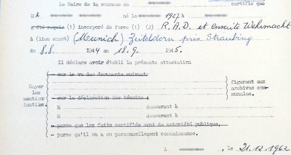 Dans une lettre datée du même jour, il indique ne plus être en possession de pièces officielles allemandes (le Wehrpass était alors demandé par l’Office National des Anciens Combattants – l’ONAC – dans un courrier daté du 31 octobre), alors qu’il l’avait toujours en sa possession. Celui-ci contenait en effet une indication majeure étant donné qu’il avait été établi en janvier 1944 et comportait vraisemblablement la mention d’engagé volontaire, et mettait ainsi en évidence son devancement d’appel, qui ne se produisait effectivement qu’en cas de volontariat. L’ONAC validera ensuite son statut de PCT, grâce à une attestation requise par lui et dans laquelle le maire du village natal de Z certifia avoir eu personnellement connaissance de son « incorporation de force » – RAD et ensuite dans la Wehrmacht – (cf. photo ci-dessous)…