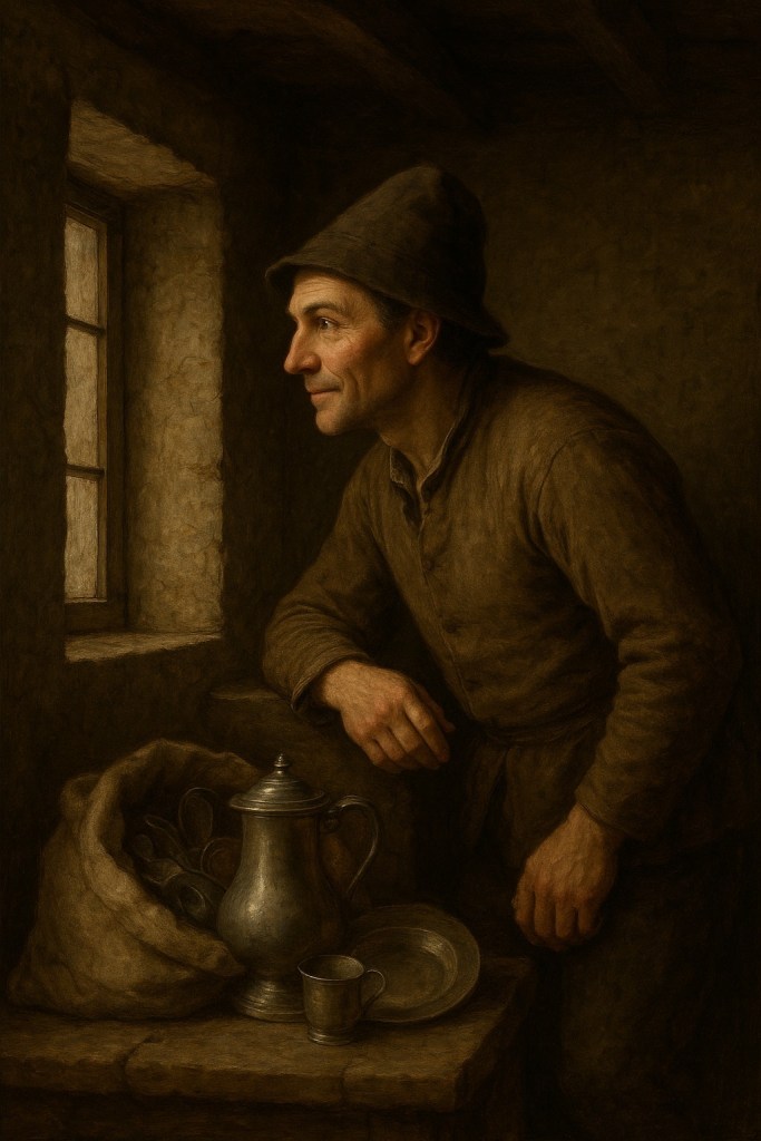 Michel Fischer dans le pigeonnier avec l’argenterie (image générée par IA)